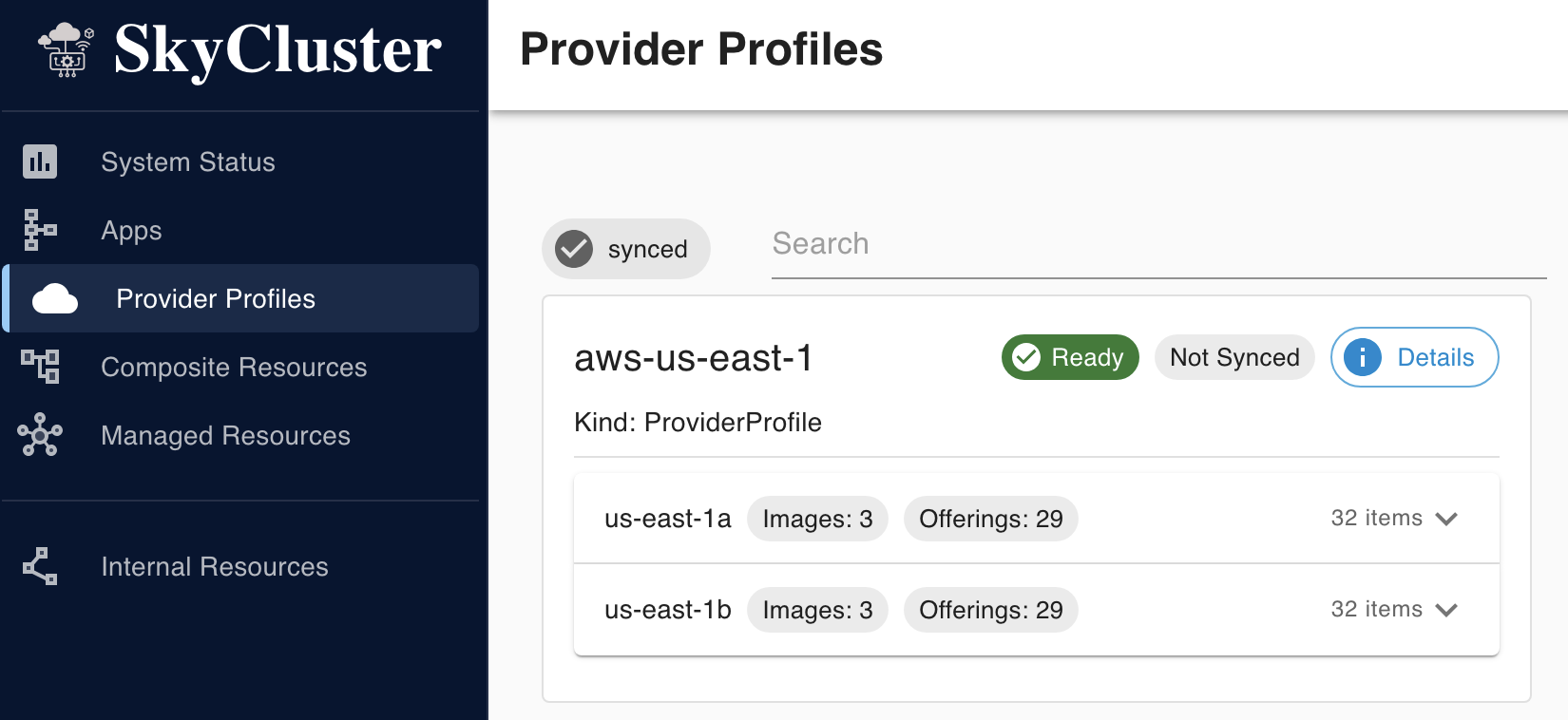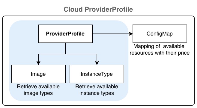 A provider is identified by its platform name and region and primary zone. When you create a ProviderProfile for a (cloud) provider, the SkyCluster operator automatically detects available images and instance types for major cloud providers such as AWS, Azure, and GCP by creating Image and InstanceType resources and stores the information in a ConfigMap in the skycluster-system namespace.